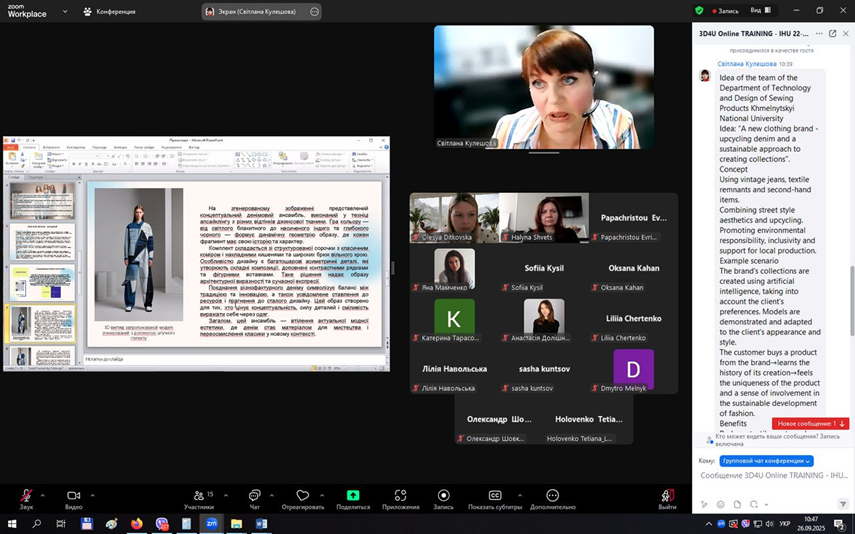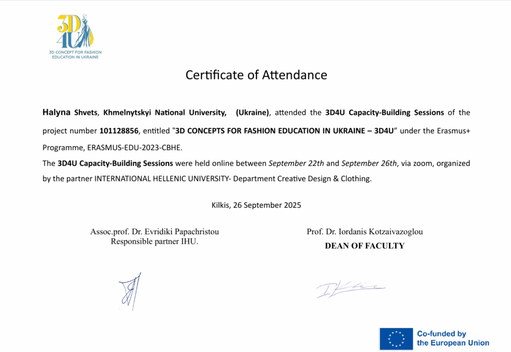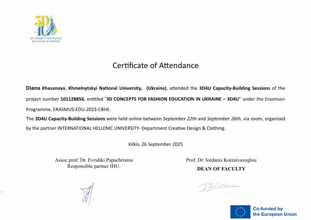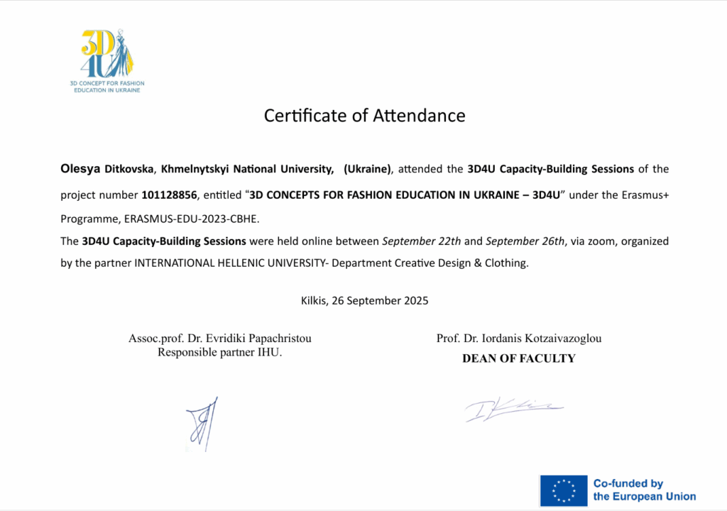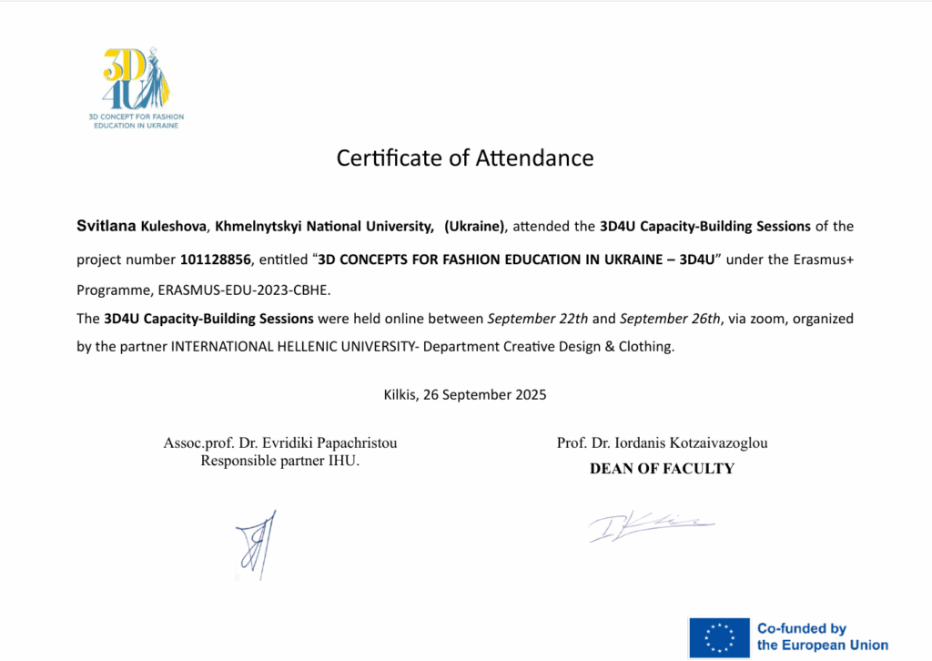 Представники кафедри Технології і конструювання швейних виробів – Світлана Кулешова, Олеся Дітковська, Галина Швець та Діана Хасанова взяли участь в онлайн-тренінгу в межах міжнародного освітнього проєкту Erasmus+ 3D4U (22–26 вересня 2025 р.).