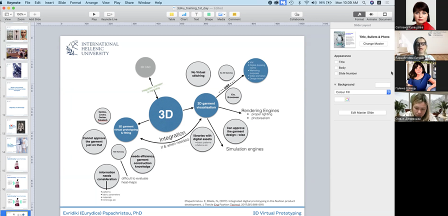 Головним інструктором тренінгу була координаторка проєкту Erasmus+ 3D4U, доктор Евридікі Папахрісту (Evridiki Papachristou) — інженер моди, фахівчиня із САПР, магістр наук, дипломована педагогиня, доктор філософії, доцентка кафедри креативного дизайну та одягу Школи дизайну Міжнародного грецького університету (IHU). Протягом п’яти днів учасники проходили інтенсивне навчання з програмного забезпечення Browzwear University та V-Stitcher для 3D-прототипування одягу.