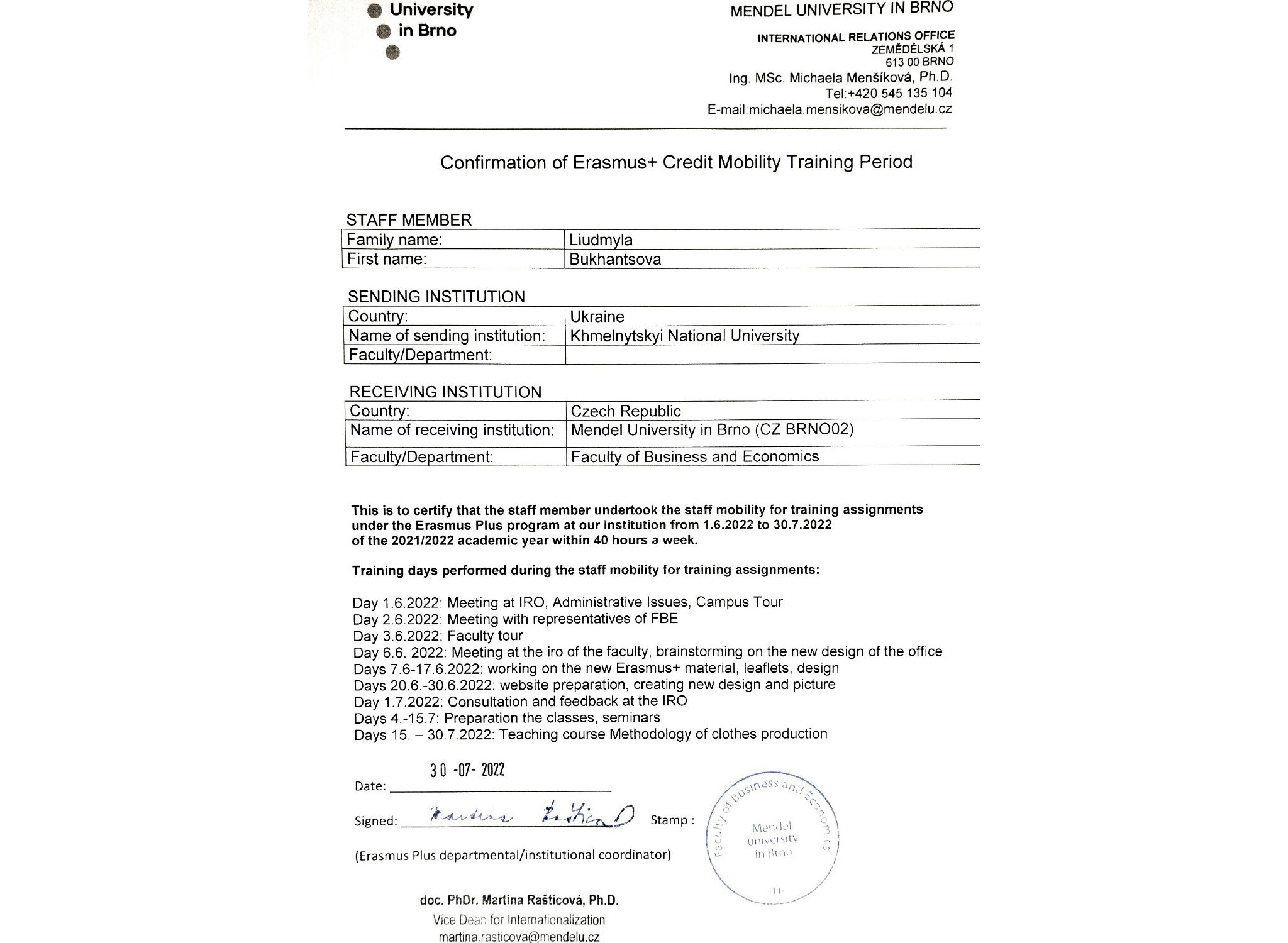 - Bukhantsova, L., Luschevska, O., Kovalchuk, D., Zakharkevich, O., Krasniuk, L., Ditkovska, O., Yantsalovskyi, O., Kuleshova, S., & Shvets, G. Adaptive Clothing Design: From Focus Group Evaluation to Functional Prototypes / Fibres and Textiles, 2025, 3–16. https://doi.org/10.15240/tul/008/2025-4-001 (Scopus, Q4)