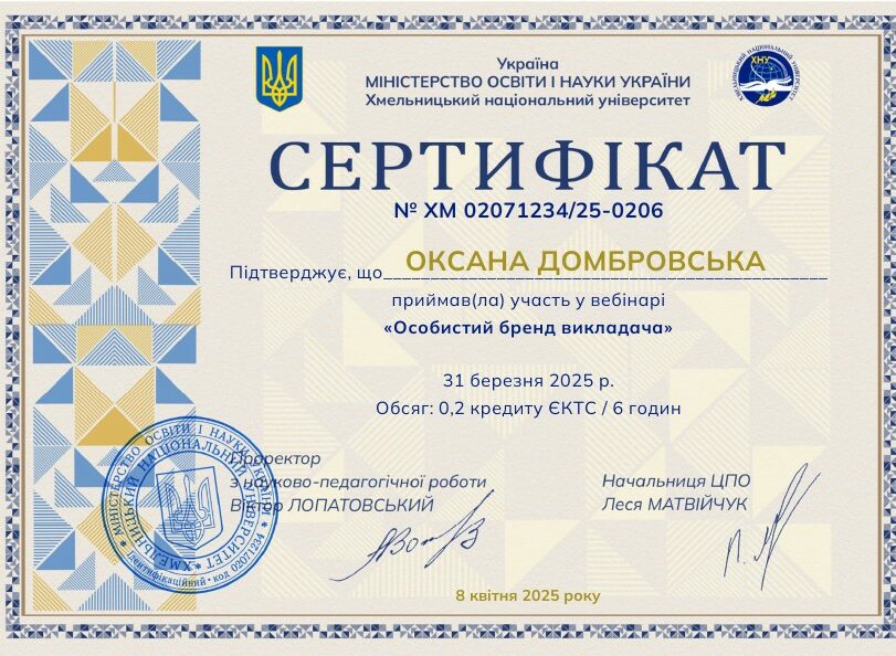 - Підвищення кваліфікації науково-педагогічних та педагогічних працівників ХНУ 2025 р. на вебінарах: Роз’яснення щодо застосування Критеріїв оцінювання якості освітньої програми 17 січня 2025 р. Сертифікат № ХМ 02071234/25-0027, Особистий бренд викладача 31 березня 2025 р. Сертифікат № ХМ 02071234/25-0206, Практичні, лабораторні та семінарські заняття: сутність та особливості проведення 23 травня 2025 р. Сертифікат № ХМ 02071234/25-0341.