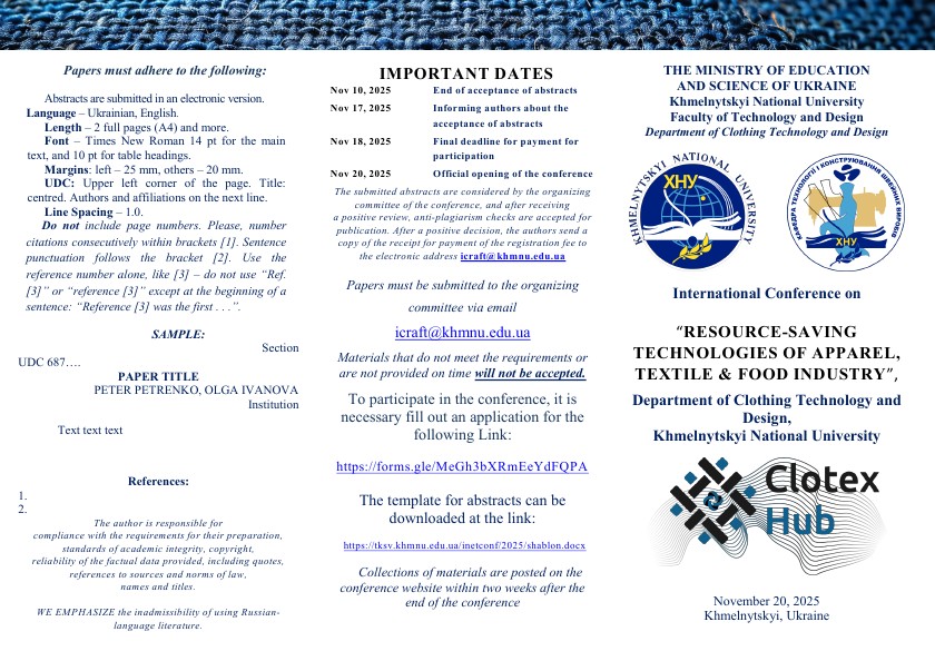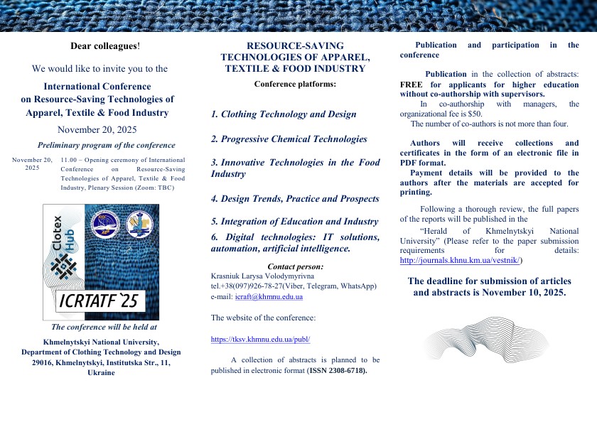 International Scientific-Practical Internet-Conference of Resource-Saving Technologies of Apparel, Textile & Food Industry, which will take place on November 20, 2025 in Khmelnytskyi, Ukraine.