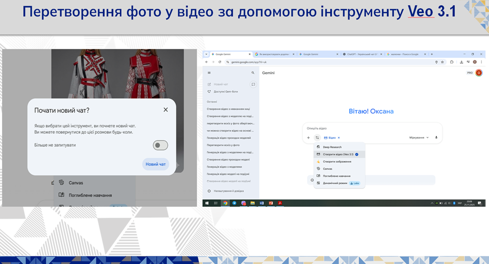 Також було розглянуто можливості генерації нових варіацій моделей на основі зображень: зміна стилю, доповнення силуету, експерименти з матеріалами та кольоровими рішеннями. Магістранти змогли використовувати власні ескізи й фотографії як основу для створення цифрових концептів, формування ансамблів або мініколекцій. Практична частина дозволила студентам у реальному часі переконатися у потенціалі AI-технологій для модного дизайну. Учасники зазначили, що використання Gemini AI значно прискорює етапи проєктування, спрощує експериментування з формами та матеріалами і сприяє розвитку важливих професійних компетентностей.