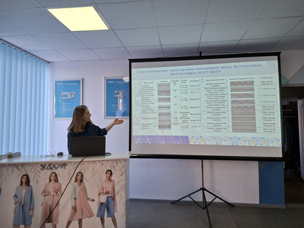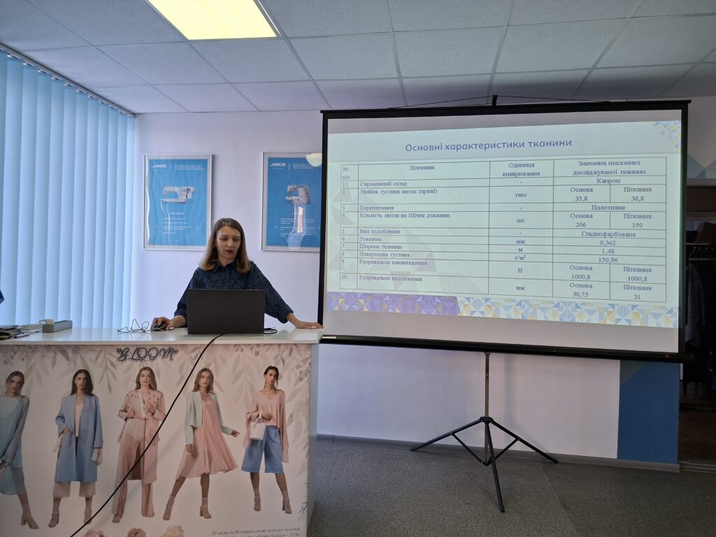 Наступними була доповідь Оксани ХАСАНОВОЇ, аспірантки групи ТЛПас-23-2, асистента кафедри технології і конструювання швейних виробів. У межах доповіді аспірантка представила порівняльну характеристику двох типів струмопровідних ниток, акцентувавши увагу на їх технологічних та експлуатаційних властивостях у процесі виконання декоративних строчок, а також обґрунтувала вибір матеріалів-основ, на яких здійснювалося формування відповідних швейних елементів.