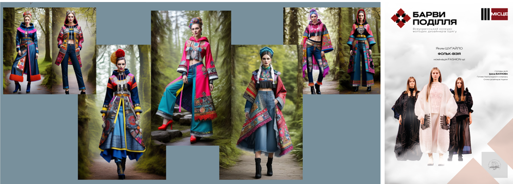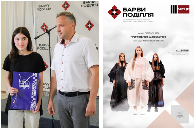 До керівництва студентськими творчими конкурсними проєктами долучились професори кафедри ТКШВ Кулешова С.Г., Захаркевич О.В. та доценти кафедри Краснюк Л.В., Лущевська О.М., Мица В.В., Швець Г.С., Домбровська О.М. Перемогу у Всеукраїнському конкурсі молодих дизайнерів одягу «Барви Поділля – 2024» здобули студентка гр. ШВ-22-1 Гольонко Анна, яка отримала диплом ІІІ ступеня у конкурсі ескізів в номінації «Живописний ескіз» (керівник доц. Лущевська О.М.) і студент гр.ШВм-23-1 Шугайло Яким, який отримав диплом ІІІ ступеня у конкурсі Fashion-Ші (керівник доц. Краснюк Л.В.).