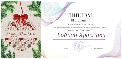 У грудні 2024 року студенти кафедри Щербакова Анастасія, Пилипенко Юліана, Дідус Мирослава, Демченко Марія, Голубєва Вікторія, Новак Ольга, Маначин Вікторія, Бойцун Ярослава (керівник доц. Краснюк Л.В.), Желіховська Анастасія, Адамова Катерина (керівник доц. Мица В.В.) взяли участь у ХХІ Міжнародному конкурсі одного образу та новорічно-різдвяного декору «Сузір’я «Каштан», м. Київ, КНУТД. Призове ІІІ місце у номінації «Листівка» виборола Бойцун Ярослава.