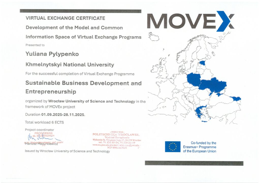 22 грудня 2025 року відбулось урочисте вручення сертифікатів 20-м студентам Хмельницького національного університету, які успішно пройшли програму віртуальних академічних обмінів в рамках міжнародного проєкту Erasmus+ MOVEx.