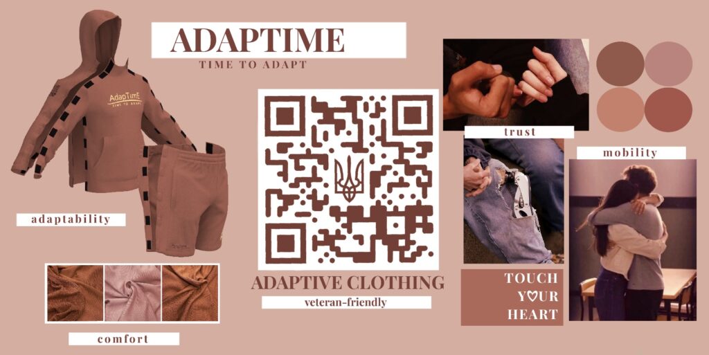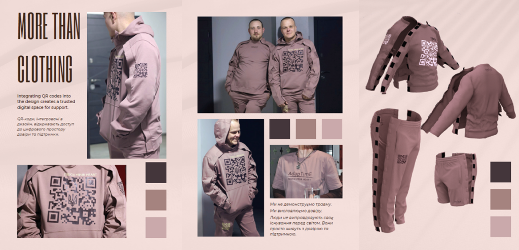 У командній роботі науковців кафедри ТКШВ Людмили БУХАНЦОВОЇ та Олени ЛУЩЕВСЬКОЇ із фахівцем спортивного одягу, власником бренду «МаксіСпорт», а сьогодні і аспірантом кафедри ТКШВ Дмитром КОВАЛЬЧУКОМ (керівник Світлана КУЛЕШОВА) виникла ідея створення не просто адаптивного одягу, а платформи підтримки ветеранів та людей із функціональними порушеннями. Для цього в дизайн адаптивного одягу інтегровані QR-коди, які відкривають доступ до цифрового простору довіри та підтримки. Цей простір містить інформацію про адаптивний одяг, інструкцію до його використання, а також інформацію про людей і бізнеси дружніх до ветеранів. Тобто розроблений одяг стає точкою входу в спільноту. Він перетворюється на живий зв’язок між людиною та світом. Він еволюціонує від продукту до діалогу, спільної мови та довірливої взаємодії.