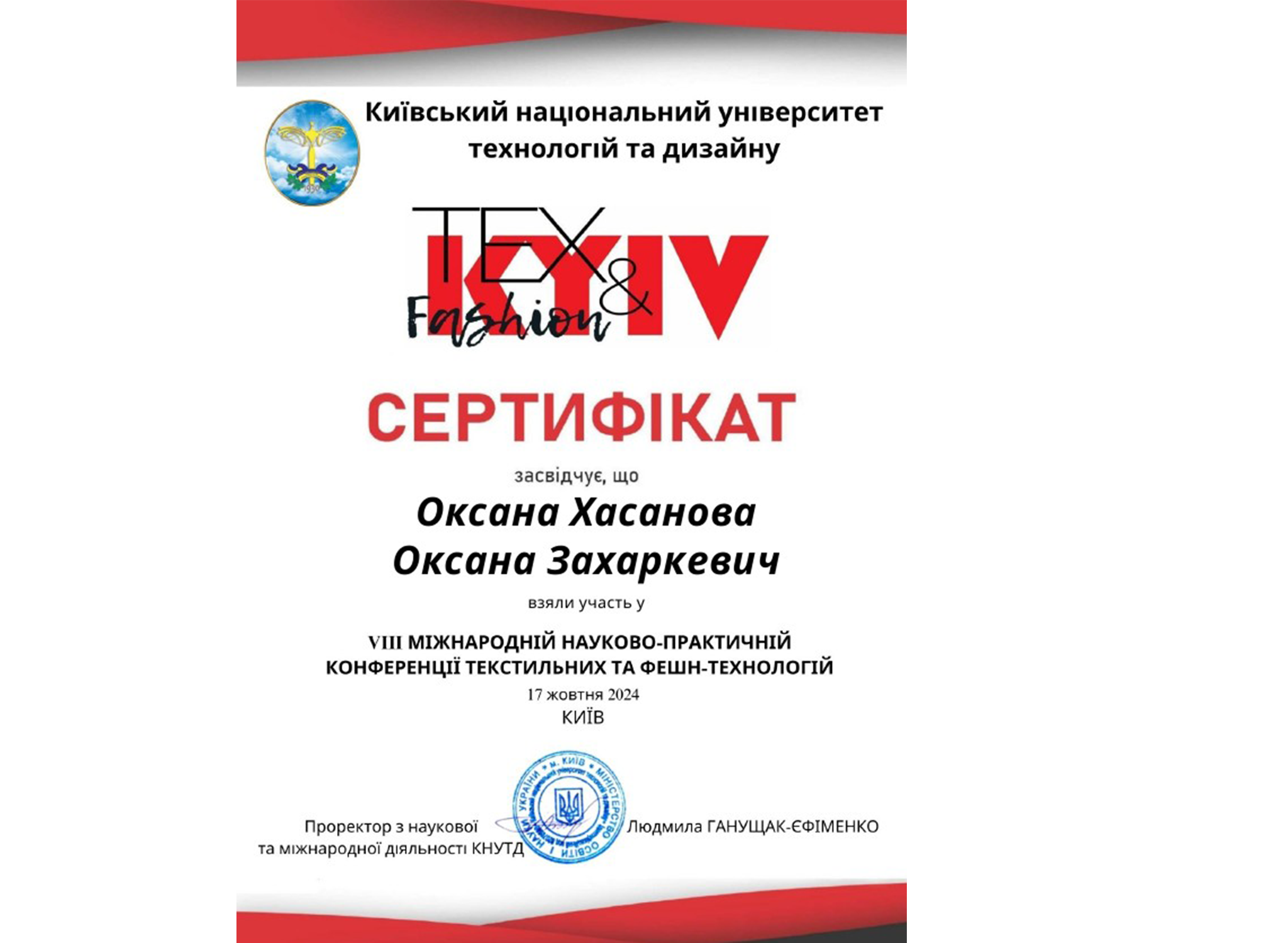 - Khasanova O., Zakharkevich O., Koshevko J., Shvets G. Study of decorative stitching with a conductive thread as an embroidery element in smart clothing // CLOTECH 2024: 15th Joint International Conference on Innovation in Clothing: conference proceedings, 5–6 September 2024, Dresden, Germany. – Dresden, 2024. – P. 58-60.