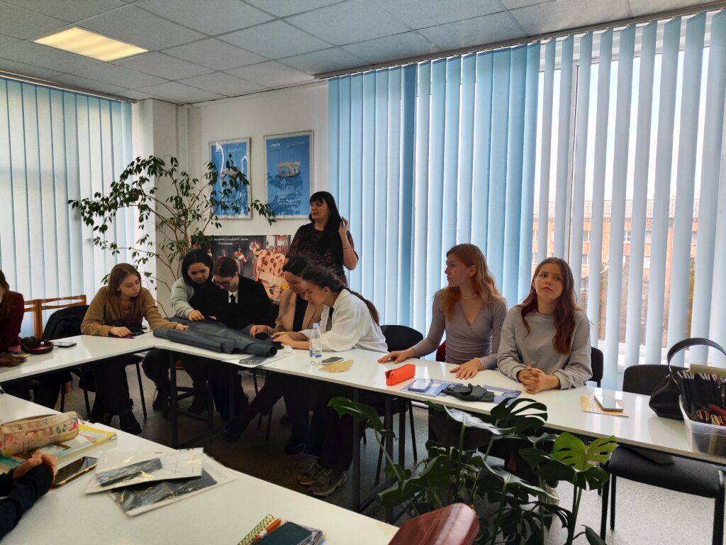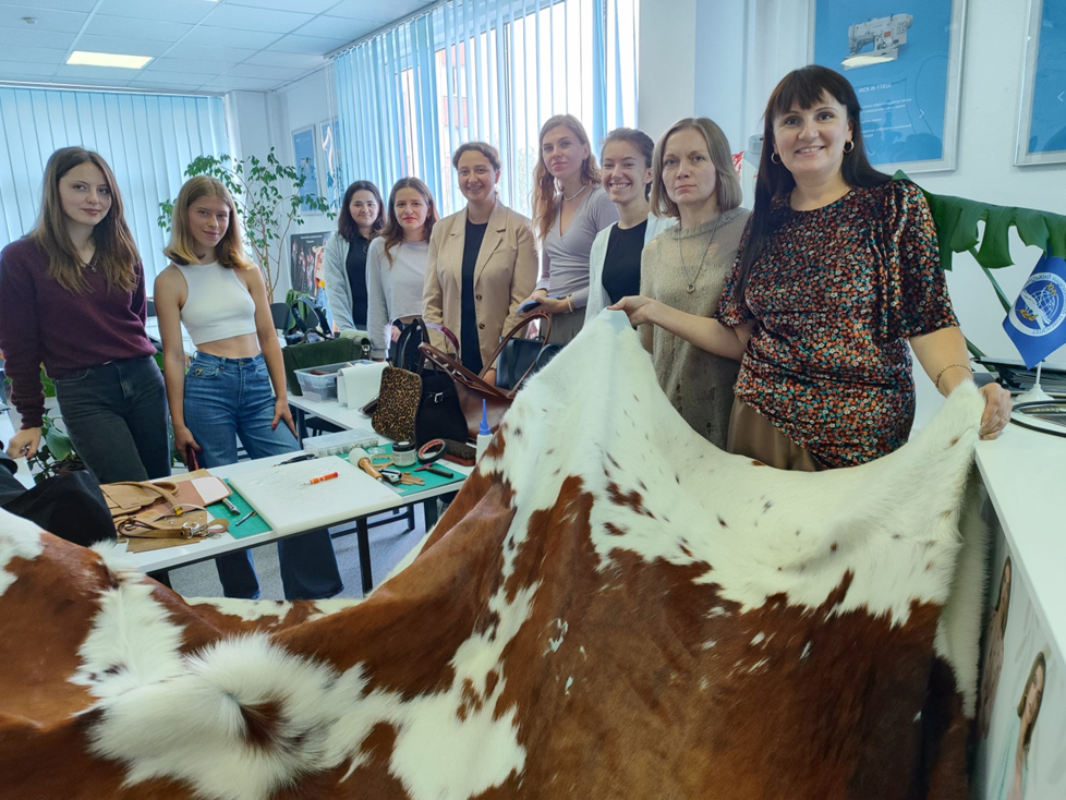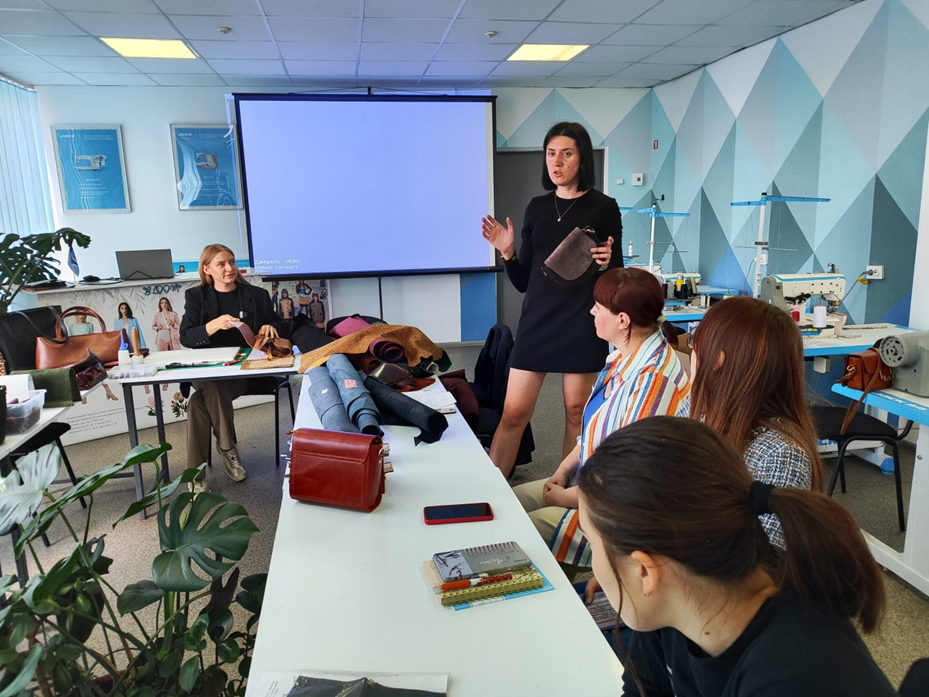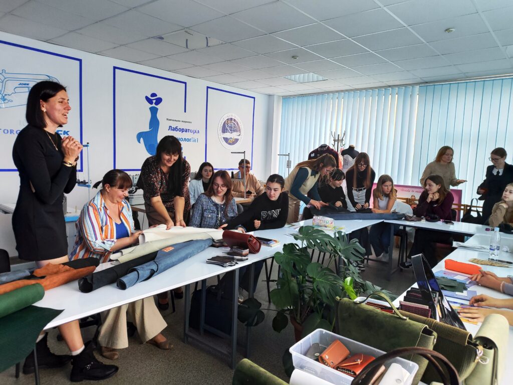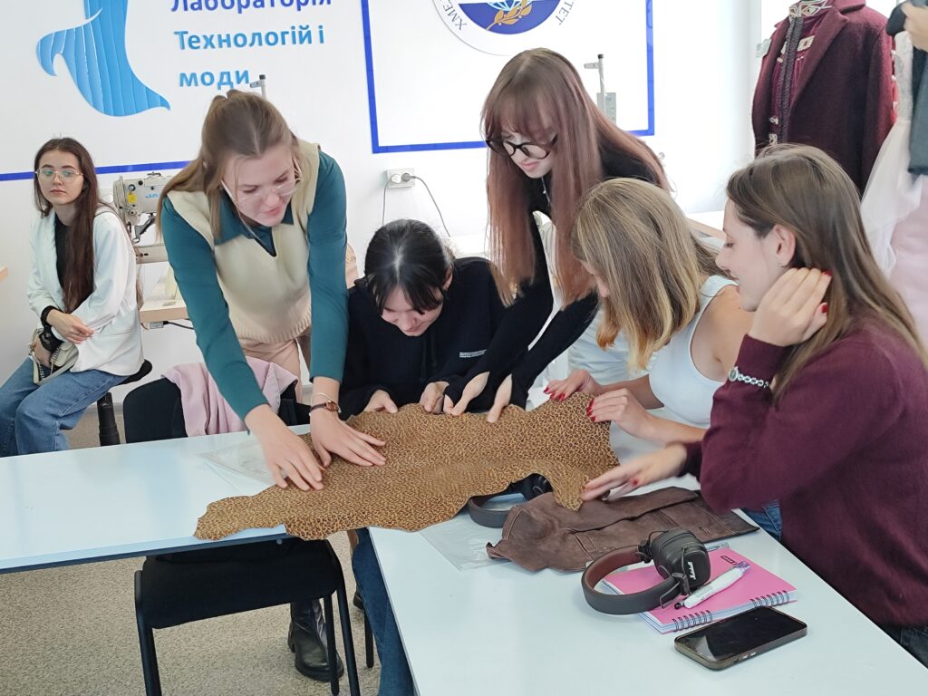 Дане заняття проведено у рамках вивчення навчальної дисципліни «Основи технології виробів» для студентів групи ШВ-22-1 (лектор – доцент кафедри технології та конструювання швейних виробів Юлія Кошевко) з метою закріплення теоретичних знань і практичного ознайомлення студентів з асортиментом шкір та фурнітури. Темою заняття обрано лекцію «Особливості виготовлення верхнього одягу зі штучної та натуральної шкіри», яка була проведена в парі з регіональним представником фірми ЕКОЖ, яка займається торгівлею шкірою для одягу та галантерейних виробів.
